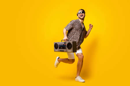 Full length photo of lucky sweet gentleman dressed print shirt glasses running holding boombox isolated yellow color background