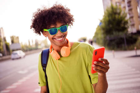 Portrait of attractive cheerful guy using device blogging listening music enjoying spending free time sunny day weekend outdoors