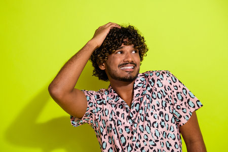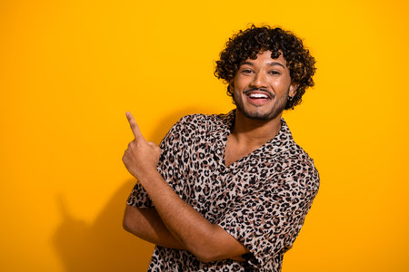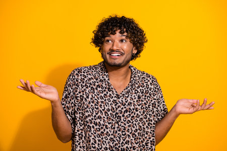 Photo portrait of attractive young male look confused empty space wear trendy leopard print clothes isolated on yellow color background