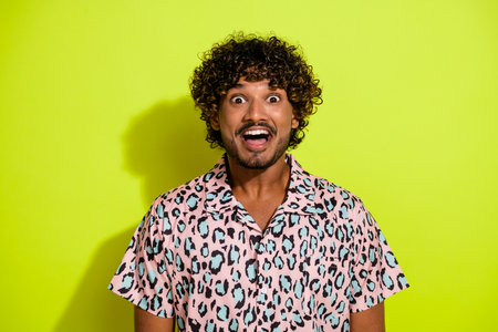 Photo portrait of nice young man excited cheerful face wear trendy leopard print garment isolated on yellow color background