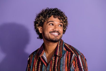 Portrait of nice young man look empty space wear shirt isolated on purple color background