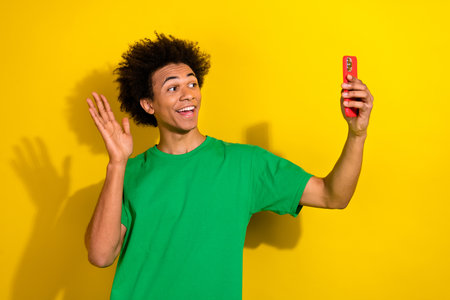 Photo of attractive funny guy wear green t-shirt recording video modern device waving arm hi isolated yellow color background