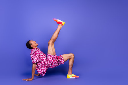 Young man in vibrant leopard print outfit posing playfully against a bold gradient purple background