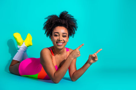 Energetic young woman in colorful activewear posing on a teal background, showcasing vibrant fashion and a healthy lifestyle