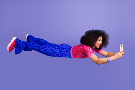 Young stylish woman floating mid-air taking a selfie with smile, vibrant outfit and colorful background