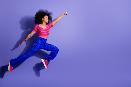 Energetic young woman jumping on a purple background wearing vibrant clothing representing joy and confidence