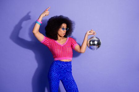 Cheerful fashionable woman in retro outfit posing with disco ball on vibrant violet background, embracing vintage trends