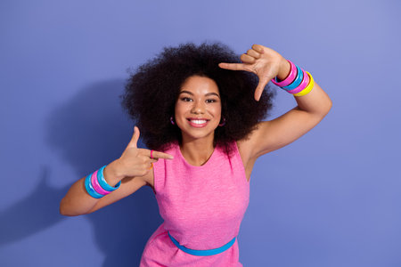 Smiling young woman with natural hair gesturing a frame sign in a pink outfit, against vibrant violet background