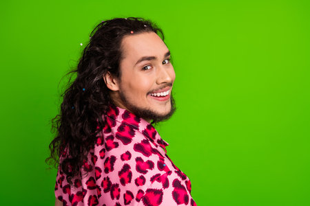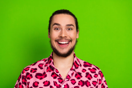 Joyful young man in stylish pink leopard-print shirt in front of green background celebrating with a happy expression