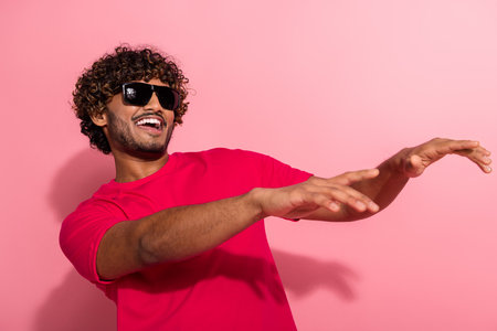 Young fashionable man in red t-shirt and sunglass posing dynamically against pastel pink background for modern expression
