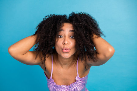 Young woman with curly hair surprised face holding her hair against a blue backdrop in a stylish casual fashion pose