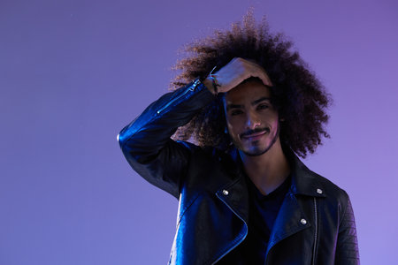 Portrait of fashion man with curly hair on blue background multinational, colored light, black leather jacket trend, modern concept.