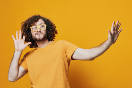 Happy young man with curly hair wearing a yellow t shirt and glasses, expressing joy with hands raised against a vibrant yellow background