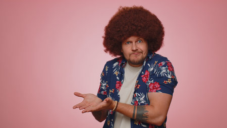 Photo closeup of uptight caucasian man with afro hairstyle frowning at camera with sad look isolated over gray background