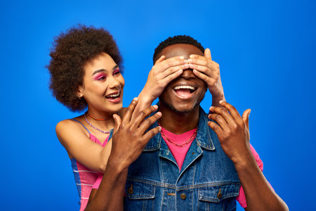 Positive young african american woman with bold makeup covering eyes to stylish best friend in denim vest and standing together isolated on blue, fashionable friends in trendy clothes