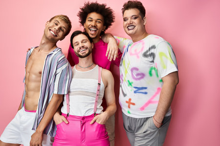 Group of friends exuding joy and pride with vibrant outfits against a pink backdrop.