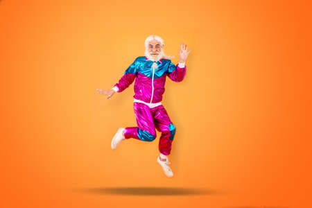 Fashionable grandfather posing with funny futuristic clothes. Senior man portraits on colored background