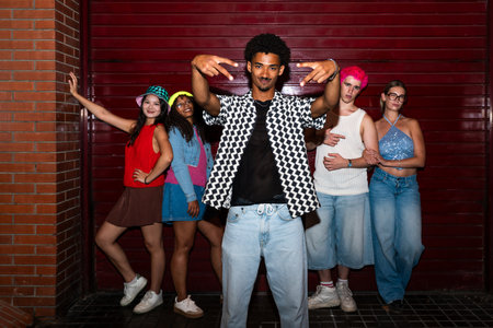 Multiethnic group of young friends having fun on the streets in the night - Stylish cool multiracial people wearing stylish clothing hanging out before party in a disco club