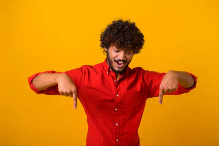 Look, advertise below. Cheerful guy pointing down place for commercial idea, looking down with toothy smile. Studio shot isolated on orange background