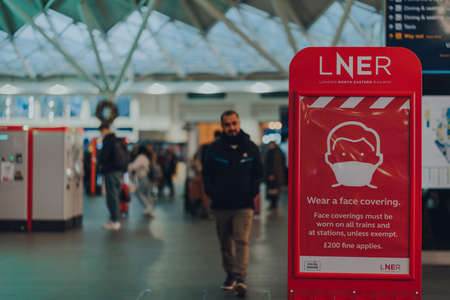 London, UK - January 01, 2022: Wear A Face Mask Sign on a LNER board inside the hall of Kings Cross train station. The requirements were introduced due to Coronavirus pandemic.