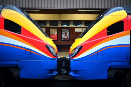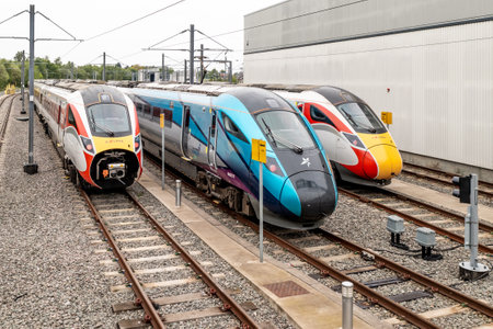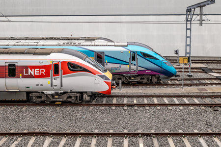 DONCASTER, UK - MAY 13, 2023. A profile view of a fleet of Hitachi high speed passenger trains in Trans Pennine Express and LNER livery on the Hitachi Maintenance Depot in Doncaster