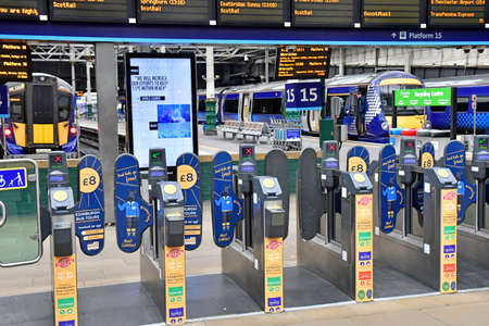 London/UK - 22/07/2019: Turnstiles leading in and out of the platforms at at the Marylebone Station, which is linking the capital to the cities of Nottingham, Sheffield and Manchester; selective focus
