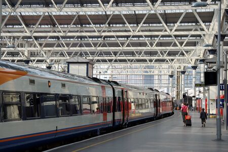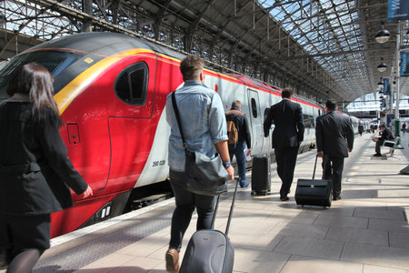 MANCHESTER, UK - APRIL 23, 2013: People board Virgin Trains Pendolino train in Manchester, UK. Virgin Trains operates since 1997 and as of 2013 uses 56 Class 390 Pendolino train sets.