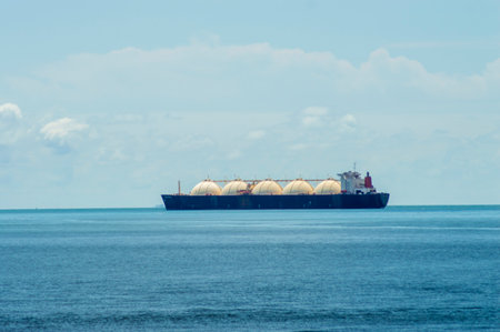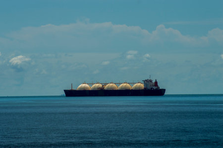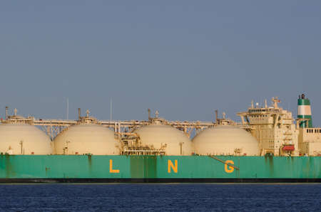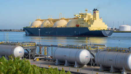 A massive liquefied natural gas tanker navigates into the port while several storage tanks stand in the foreground. The clear sky and water reflect a peaceful typical atmosphere of midday