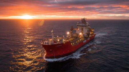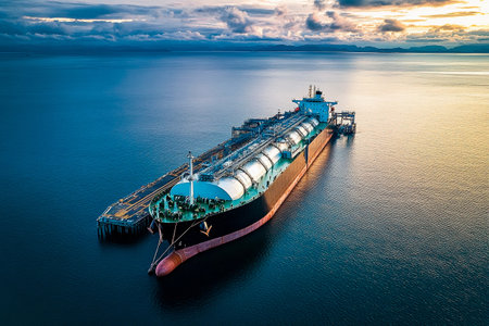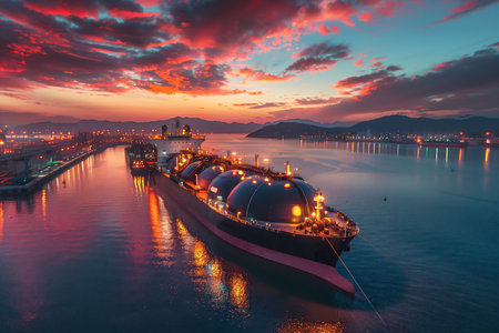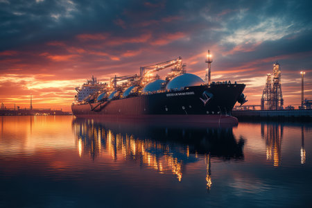 A large liquefied natural gas transport ship is docked at an industrial port, illuminated by the sunset colors reflecting on the waters surface.