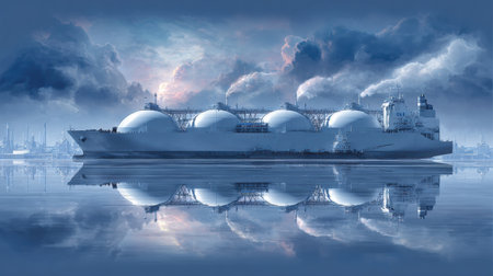 LNG tanker loads at a terminal with cryogenic domes. Vapor trails add a dynamic feel to the scene against a cool blue backdrop.