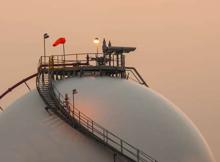 Industrial gas storage tank. LNG or liquefied natural gas storage tank. Spherical gas tank in petroleum refinery. Above-ground storage tank. Natural gas storage industry and global market consumption