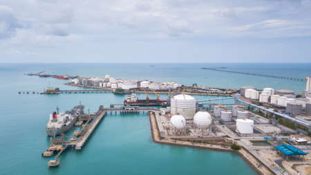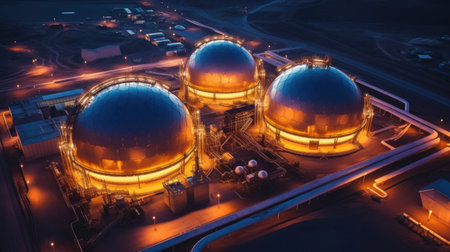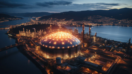 A stunning aerial drone shot of LNG terminal with storage tanks. Creating using generative AI tools