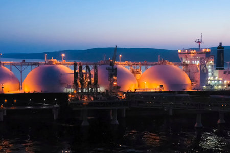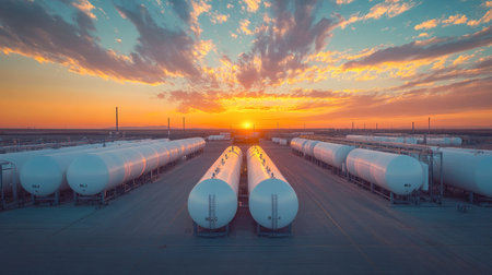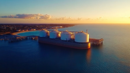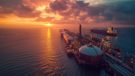 A beautiful sunset scene over LNG storage tanks at a coastal port, showcasing the industrial landscape harmonized with nature's vibrant colors.