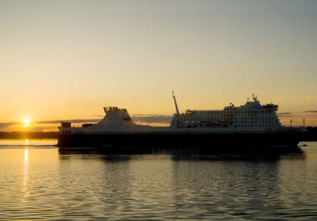 Passenger and freight ferry against a sunset in the Baltic sea.