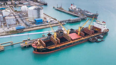 Berths of the cargo port with tankers and bulk carriers. Shooting from the air.