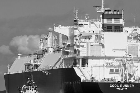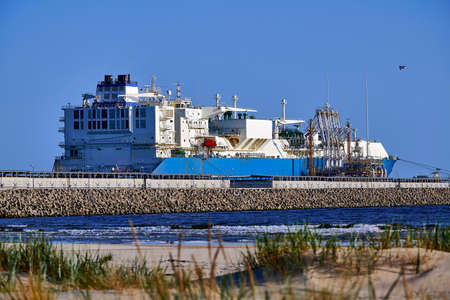 SWINOUJSCIE, WEST POMERANIAN / POLAND - 2020: The LNG tanker maneuvers for mooring at gas port terminal