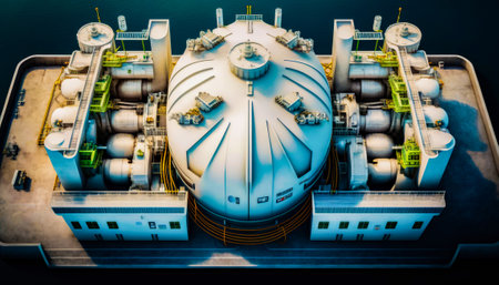 Industrial complex with a massive LNG storage tank designed for holding liquefied natural gas, showcasing modern energy infrastructure.