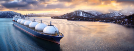 Large industrial ship transporting liquefied gas tanks sailing in the calm waters of an industrial harbor at sunset..