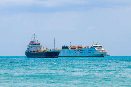 The largest seaport in Russia, Novorossiysk. Commercial sea port on the Black Sea in Tsemesskaya Bay. Crop a frame with a detailed zoom.