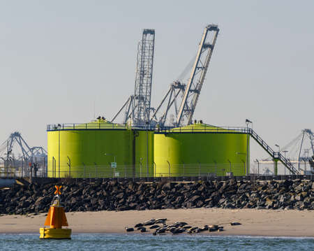 Storage tanks at GATE LNG terminal and seals on beach / Rotterdam, Netherlands