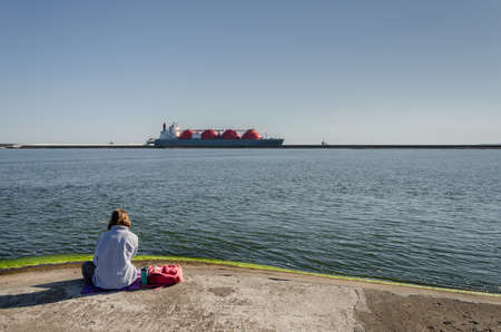 LNG TANKER - Ship on the horizon and a girl on the breakwater