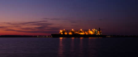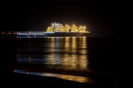 Gas carrier at night against the background of dark sea.
