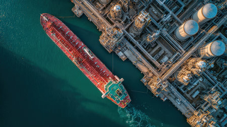 Aerial View of Oil Refinery with Storage Tanks and Docked Tanker. Captures global energy logistics