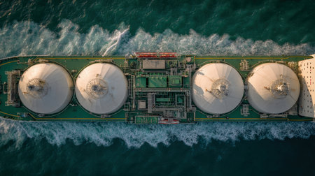 Aerial image of a large modern gas carrier ship featuring four white domed tanks and green deck textures. The vessel moves steadily through turquoise sea with minimal waves.