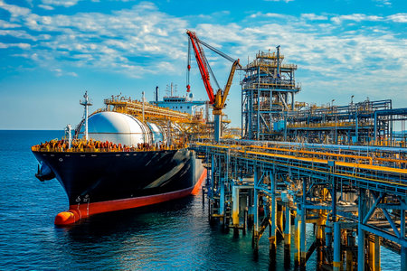 A massive LNG carrier docked at a bustling coastal terminal under a bright blue sky. Workers manage operations on the vessel and equipment, highlighting industrial activity and maritime logistics.