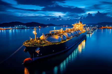 A large tanker gracefully rests at the harbor, surrounded by calm waters reflecting city lights. The twilight casts a magical glow as the vessel prepares for cargo unloading in a bustling port.