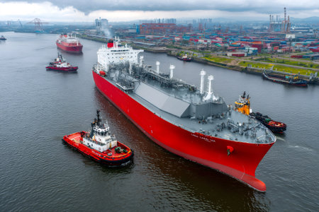 Large lng tanker navigating a busy industrial port with tugboats assisting, showcasing global maritime transport and energy logistics