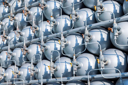A lot of different small metal bottles filled with gas or gasoline are stacked in large piles and illuminated by the bright warm daytime sun