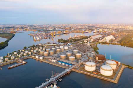 Aerial view of large fuel storage tanks at oil refinery industrial zone in the cargo seaport