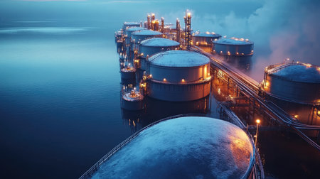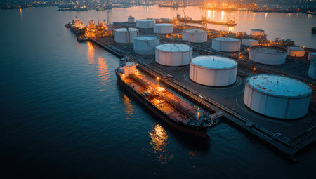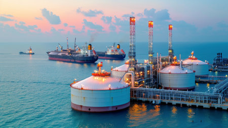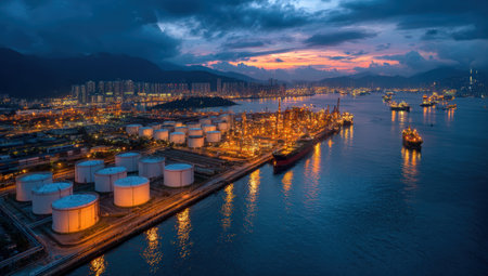 Aerial perspective of an oil terminal at twilight, with illuminated storage tanks and a cargo ship, reflecting vibrant lights on the water, highlighting industrial activity